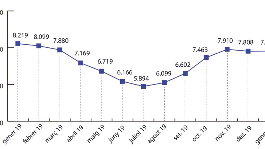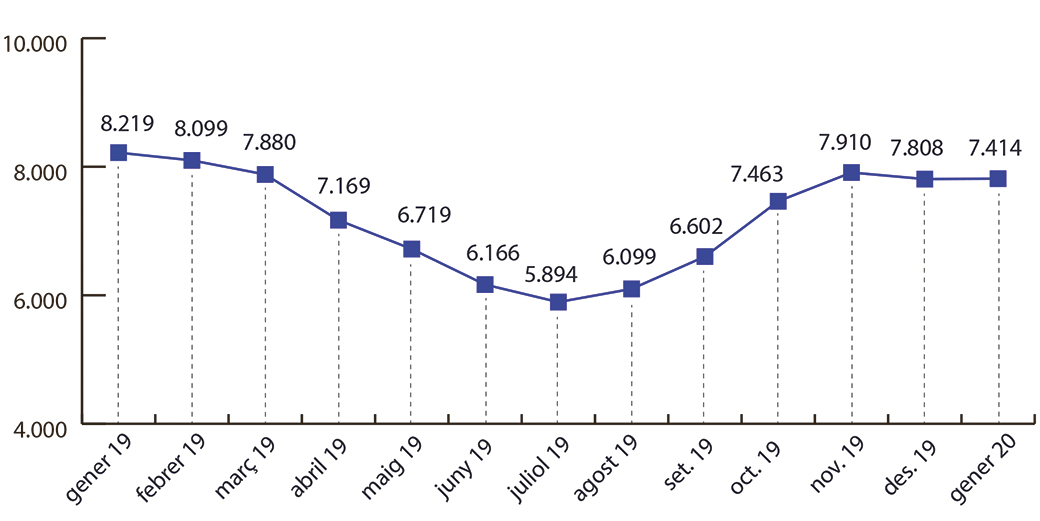 A banda, i en referència a la variació mensual, la xifra de persones sense feina al tancament del gener es manté pràcticament inflexible si es compara amb els desocupats del desembre: en aquest sentit, la variació relativa ha estat del 0,08%, després que el SOC hagi registrat sis persones inscrites més (al desembre hi havia registrades 7.808 persones sense feina).