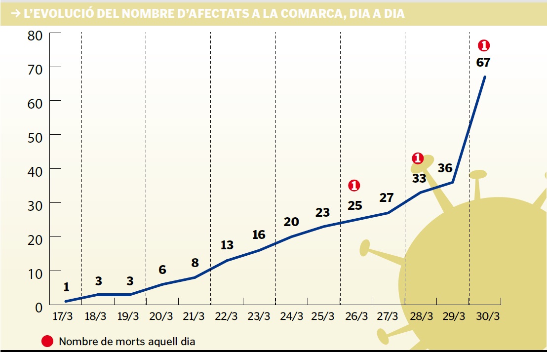 Tal com es preveia, la contenció de casos per coronavirus a l’Alt Empordà ha deixat de ser la tònica dominant, malauradament. En només 24 hores la comarca no només ha sumat una nova víctima mortal per la Covid-19, sinó que els casos totals coneguts per la Fundació Salut Empordà han passat de la xifra de 45 a 78. Actualment l’hospital comarcal està atenent 67 casos, segons el darrer balanç. Diumenge la xifra era de 36 pacients en tractament i ahir dilluns es va disparar fins als 67 malalts [vegeu el gràfic].
