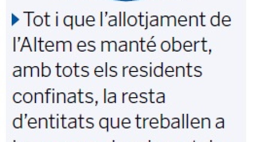 En la fase més inicial de la crisi sanitària, algunes famílies van ser objecte de crítiques veïnals per sortir de casa amb uns menors que, legalment, podien trepitjar el carrer per prescripció mèdica. Amb el pas dels dies, la polèmica es va anar allunyant del focus mediàtic, i aquests col·lectius no van tornar a ser objecte d’atenció fins a la setmana passada, quan Dincat (que és el principal representant de les persones amb discapacitat intel·lectual de Catalunya) va emetre dos comunicats. En un anunciava que ha impulsat una campanya de captació de fons per poder comprar material de protecció per als professionals que tenen cura d’aquest segment de població, i en l’altre, demanaven a les administracions que es garanteixi la viabilitat dels centres especials de treball (CET) i es protegeixin els llocs de feina de les persones amb necessitats específiques.