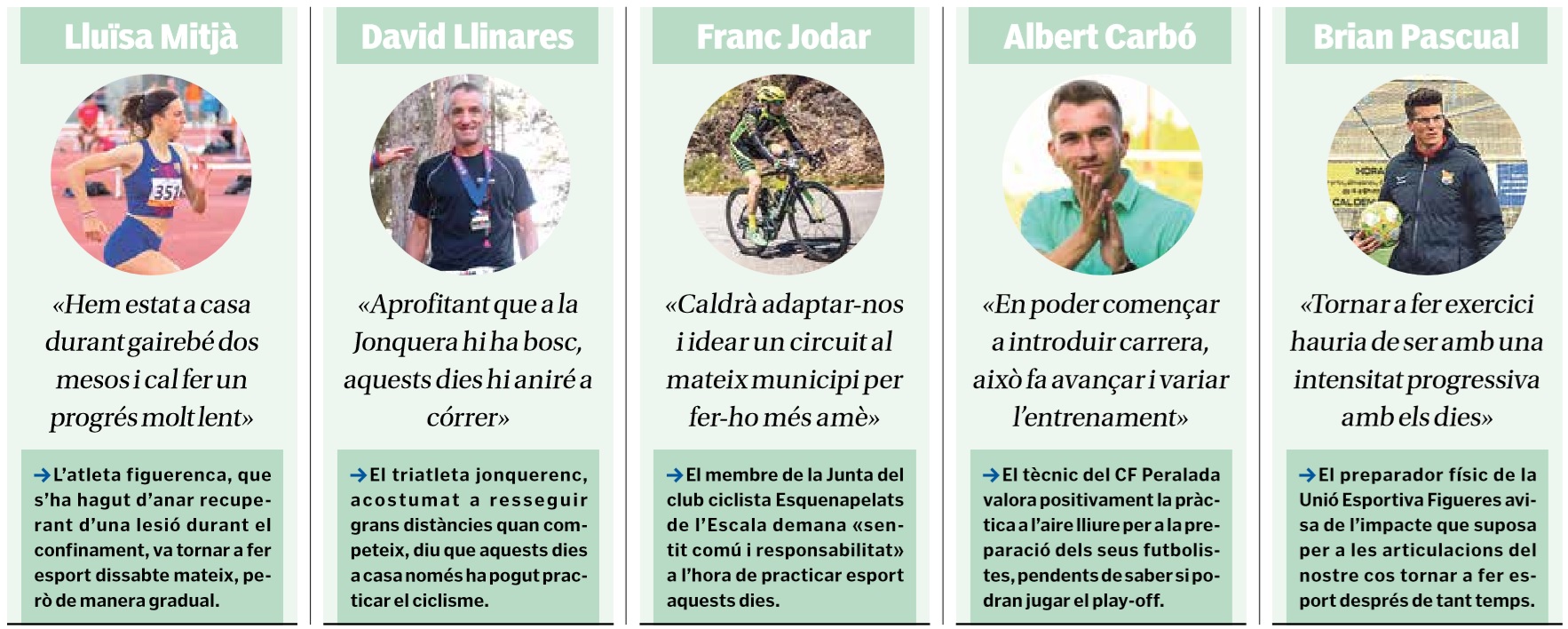 Més enllà dels joves valors de la comarca, aquests últims dies també es deixen veure pels carrers i entorns de la contrada adults molt vinculats a l’esport. És el cas de l’atleta figuerenc Jordi Blanch, medallista mundial i europeu en categoria veterà en diverses ocasions. «Tornar a córrer a l’aire lliure és un pas important, ja que suposa afegir una qualitat física que, almenys jo, ara no tenia», explica l’empordanès, qui durant aquests dies reclòs a casa s’ha entrenat amb diversos aparells, com ara peses gomes o fitballs.