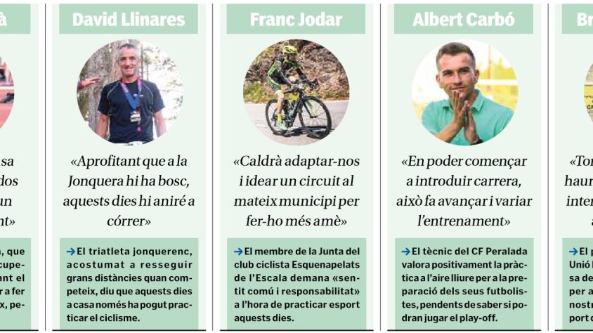 Qui també va sortir a córrer va ser el triatleta David Llinares, acostumat a competir en grans distàncies. El primer dia, de fet, va completar 67 quilòmetres amb bicicleta, resseguint tres vegades el municipi de la Jonquera, on resideix. De fet, durant aquestes setmanes de confinament el ciclisme és l’única cosa que ha pogut practicar, juntament amb exercicis de força amb gomes. «Aprofitant que aquí hi ha bosc, aquests dies hi aniré a córrer», afegeix just abans de recalcar que el més dur, durant aquests dies a casa, ha estat el canvi de xip: passar de fer esport a l’exterior a fer-ho dins del domicili.
