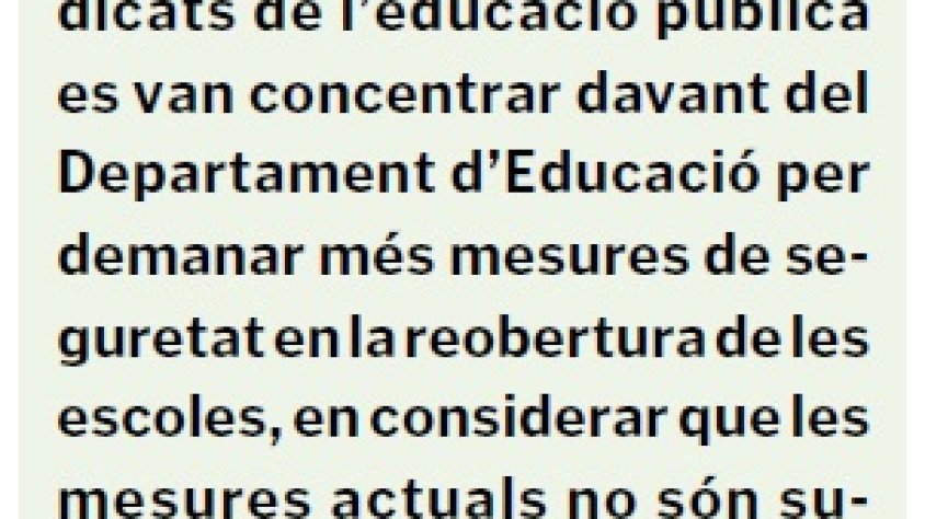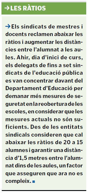 EL PROFESSORAT. A tot aquest gruix d’alumnat el formarà un total de 1.777 docents als centres públics, tal com indiquen les dades d’Educació. Tot i això, hi haurà també fins a 78 professors que reforçaran els centres públics, privats i concertats (escoles, instituts escola i instituts).