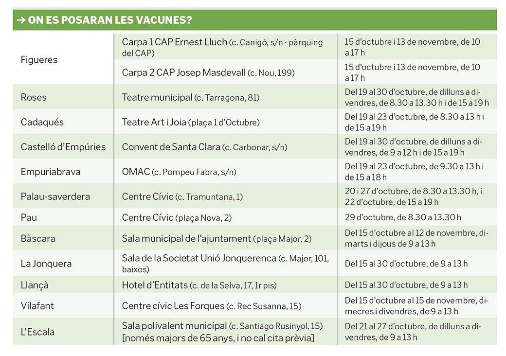 Precisament el mateix dijous va començar la campanya de vacunació contra la grip. Una campanya que aquest 2020 s’ha avançat un parell de setmanes respecte del 2019, i que serà diferent de les anteriors a causa del coronavirus: enguany la major part de les vacunes no es posaran als centres d’atenció primària (CAP), sinó que s’han habilitat un total de 13 espais alternatius perquè la població de més risc s’hagi de desplaçar als centres mèdics. L’objectiu: evitar aglomeracions als CAP i als consultoris locals, i garantir que es compleixen totes les mesures anti-Covid.