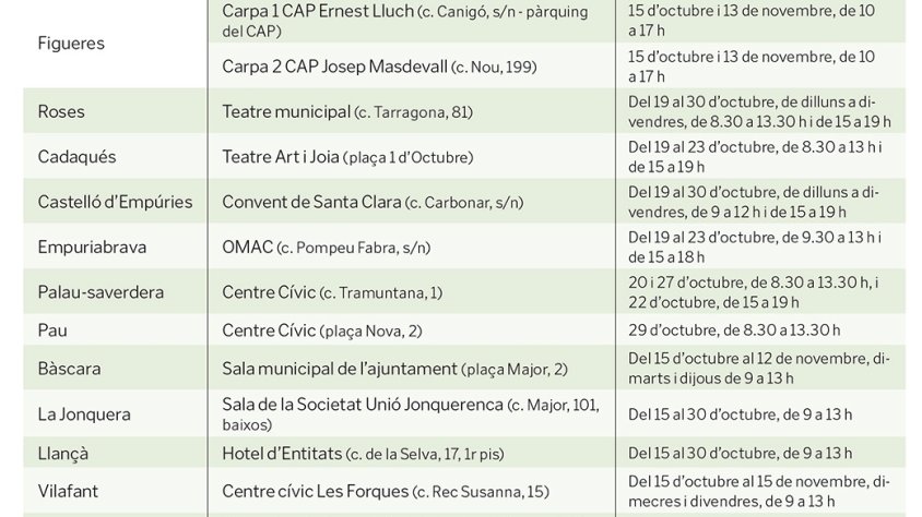 Així, algunes infermeres i auxiliars dels EAP (equips d’atenció primària) es desplaçaran a locals cedits pels ajuntaments o, en el cas de Figueres, carpes que s’instal·laran a fora dels CAP. Però tot i així –excepte en el cas de l’Escala– els usuaris hauran de demanar cita prèvia, ja sigui a través del web de La Meva Salut, o trucant directament al dispensari.