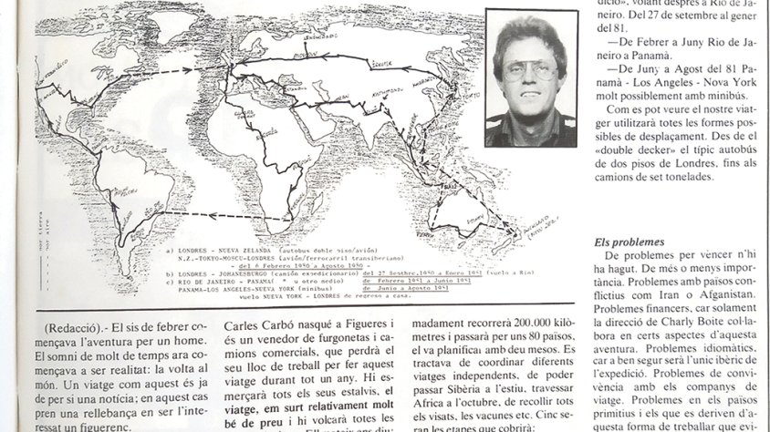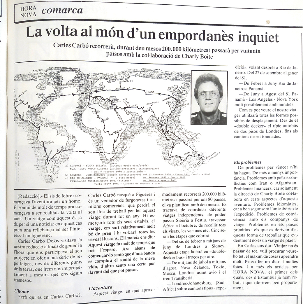 El 2 d’abril del 1980 la pàgina 19 del setmanari HORA NOVA estava encapçalada pel següent titular: «La volta al món d’un empordanès inquiet». La notícia feia referència al viatge que el figuerenc Carles Carbó havia iniciat el 6 de febrer del mateix any. L’aventura constaria de 200.000 quilòmetres en deu mesos al voltant del món.