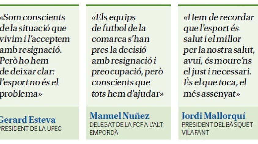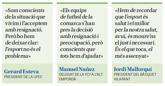 Malgrat el comunicat de la UFEC, hi va haver casos com el de la Federació Catalana de Futbol que van esperar el posicionament oficial del Tribunal Superior de Justícia de Catalunya (TSJC) per confirmar les mesures a les seves respectives competicions. «Els equips de l’Alt Empordà s’han pres la decisió amb resignació i preocupació, però al mateix temps són conscients que tots hem d’ajudar per tal d’evitar els contagis», explica el delegat de la federació futbolística a l’Alt Empordà, Manuel Nuñez, que es mostra concís a l’hora de parlar d’una hipotètica cancel·lació de la competició, tal com va succeir a la primavera: «El que ha aprovat el Procicat és una aturada de quinze dies per rebaixar els contagis, però en cap moment s’ha plantejat cancel·lar la competició, ni de bon tros. En el cas del futbol s’han realitzat entre amistosos i partits oficials més de 15.000 partits, i la incidència és molt poca».