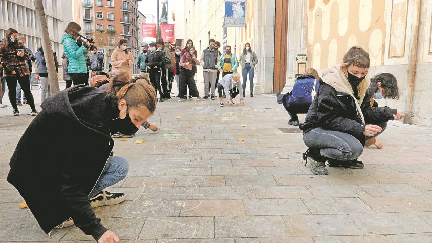 Els assistents, a més a més, han escrit lemes amb guix a la vorera del davant l’edifici reivindicant que la cultura «és segura», un «bé essencial» i també «treball». Critiquen que se’ls hagi deixat «a l’estacada i sense futur», amb quasi nul·les perspectives laborals.