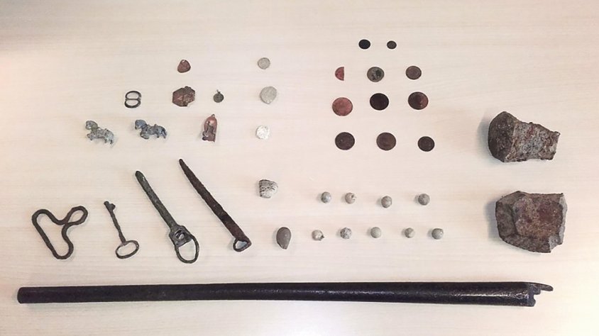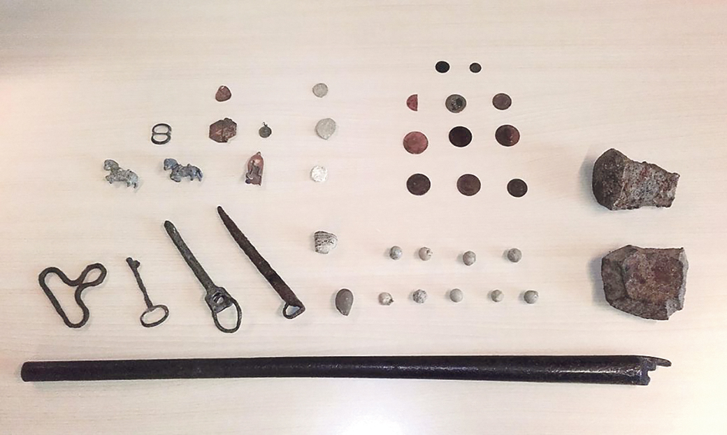 El conjunt està format per 13 monedes d’entre els anys 1658 i 1879; 11 bales de mosquet, fetes de plom, dels segles XVII i XVIII; tres insígnies de bronze i un precinte de plom del segle XIX; cinc objectes metàl·lics diversos, dels segles XVIII i XIX; dues figures petites en forma de cavallets, fets d’estany (aprox. 1890); una sivella de ferro per a cinturó, probablement del segle XIX; dos fragments de bola de canó, de ferro, del segle XVIII; i un canó de ferro forjat d’un mosquetó de pedrenyal, d’aproximadament l’any 1750.