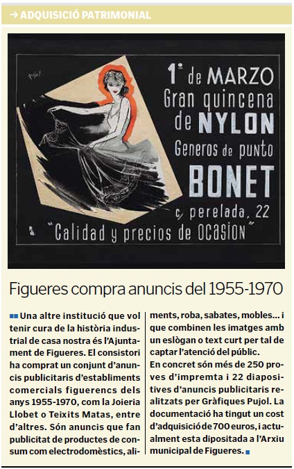 A LA COMARCA. Tot i que encara en queden molts per catalogar, el nombre d’elements identificats a l’Alt Empordà va augmentant. Actualment ja s’hi troben catalogats elements tan emblemàtics com els »Gronxadors Chocolates Torras» de Terrades, el «Rètol Pirelli» de Figueres, la «Placa Altimètrica» de Portbou, el «Rètol Cupertine» de Masarac, la «Casella de Peons de camí» d’Avinyonet de Puigventós, el «Rètol publicitari Michelin» de Llançà, o les plaques de rajola ceràmica dels municipis de l’Espolla, Rabós, Garrigàs, Sant Miquel de Fluvià, Pont de Molins, Vilafant i Avinyonet de Puigventós.
