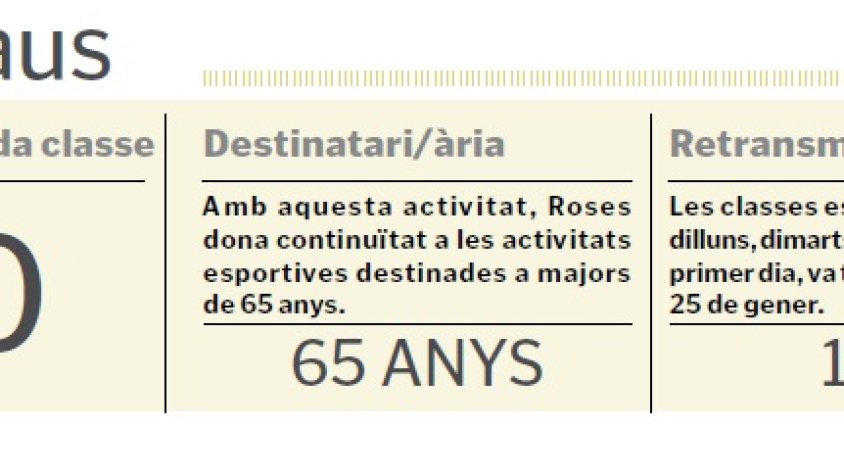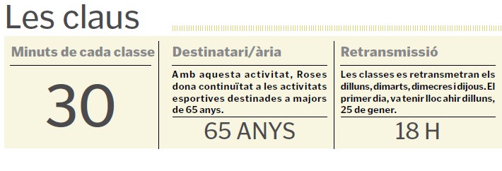 Amb l’objectiu de continuar oferint una pràctica esportiva saludable malgrat el context pandèmic d’aquests dies, l’Àrea d’Esports de l’Ajuntament de Roses va iniciar el passat dilluns una nova proposta destinada, en aquest cas, als participants de les activitats esportives dirigides a la gent gran, que passaran a realitzar-se de manera televisada. L’objectiu, segons els organitzadors, és el de facilitar una opció fàcil i segura per mantenir-se actiu a un públic que, generalment, no té massa domini de les noves tecnologies.