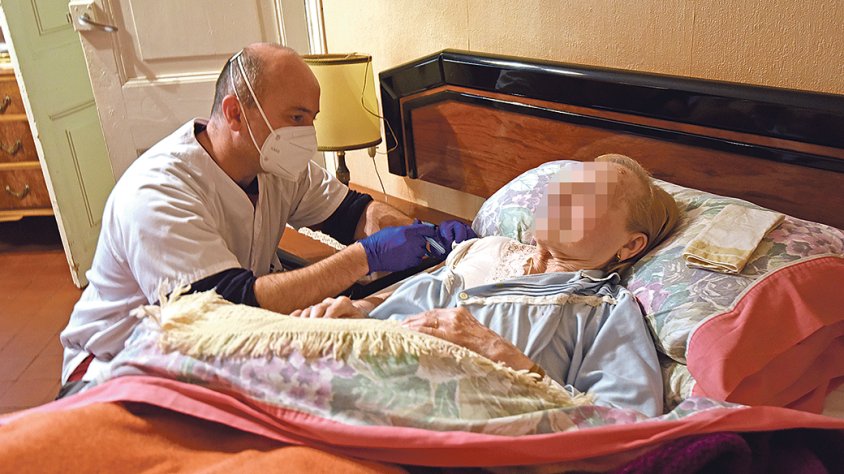 La reconstitució del vial obliga a fer el desplaçament a peu perquè «un sotrac de cotxe podria fer malbé la vacuna», explica l’Albert. També afegeix que «prèviament s’ha fet un feina laboriosa per determinar el llistat de grans dependents i d’atenció domiciliària que es vol vacunar». A més d’aquestes persones, els seus cuidadors també tenen l’opció de rebre el vaccí. Un cop fet el llistat, es fan grups de sis persones que tenen proximitat geogràfica. El motiu és que de cada vial en surten sis dosis. Un cop s’arriba al domicili del pacient, i es comprova que tot està a punt, es posa la injecció. Després, un dels infermers es queda fent guàrdia uns 15 minuts per assegurar que no hi ha cap problema d’al·lèrgia o reacció adversa.