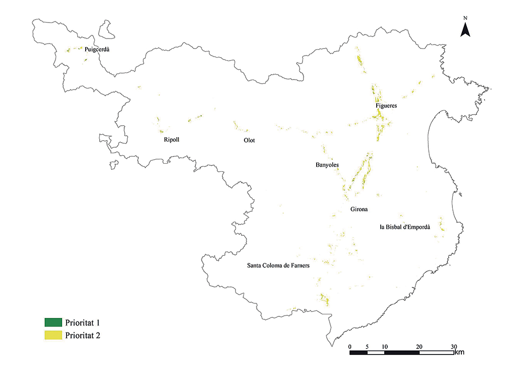 Zones prioritàries a la demarcació[/caption]En qualsevol cas, el cap d’àrea del servei de Medi Ambient de la Diputació, Marc Marí, avança que «fent una primera anàlisi, tenim suficient espai apte com per encabir energies renovables sense necessitat d’afectar aquells que ja en aquest primer exercici estan apuntant com a poc aptes o gens aptes». I això, afegeix, tenint en compte que és un estudi basat en sòl no urbanitzable. Si a més s’hi afegeixen, per exemple, les teulades, el resultat és que «no només podem proveir les necessitats energètiques de les comarques gironines, sinó que, a més a més, podem aportar el nostre granet de solidaritat a la resta del territori».