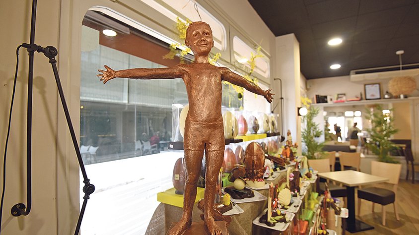 A la pastisseria Òpera de Figueres s’hi troba des de fa uns dies una mona molt especial. Una figura d’un nen de 80 centímetres d’alçada creada amb més de 15 quilos de xocolata amb llet, obra del pastisser i propietari de l’establiment, Salvador Muñoz.