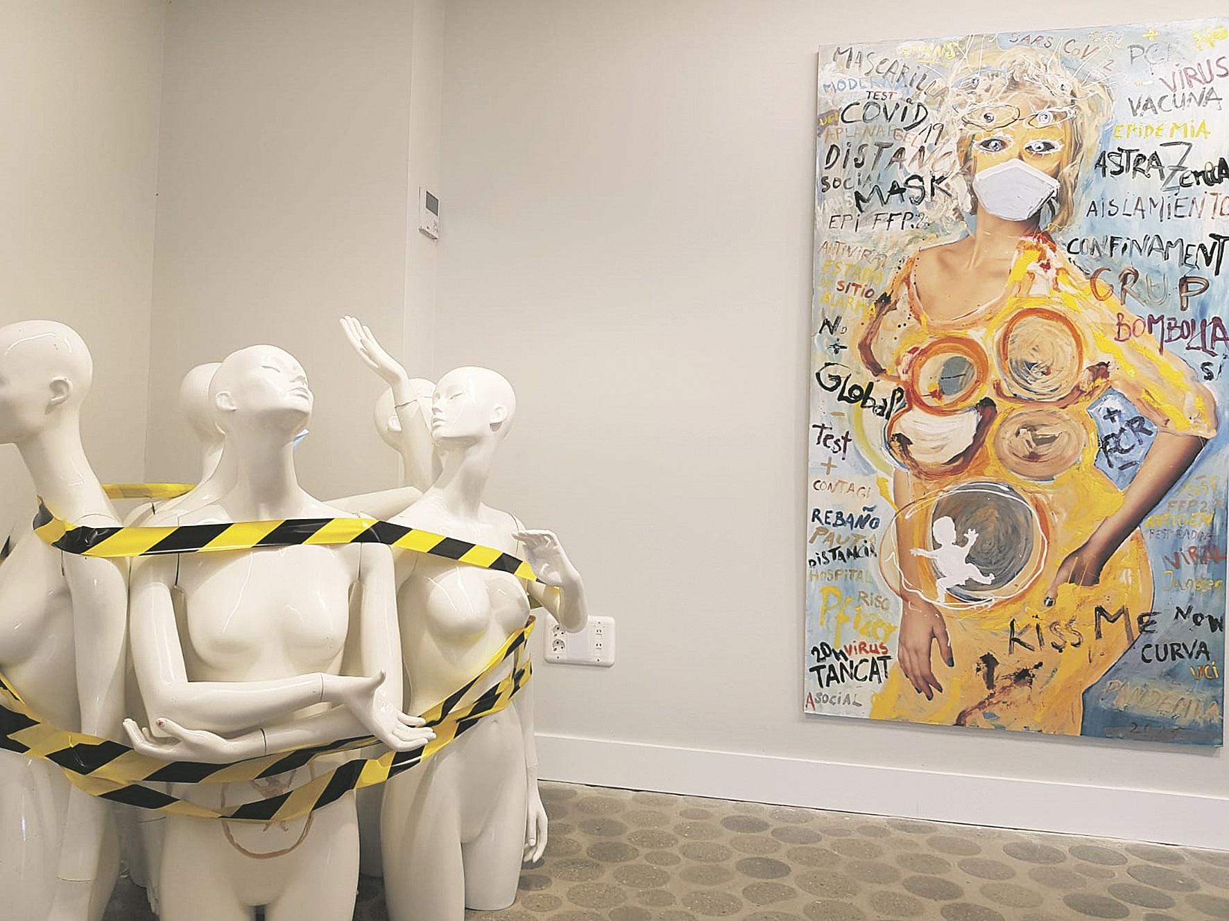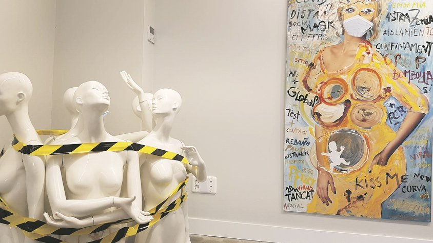 L’artista rosinc Juanjo Viñuela exposa a Ca l’Anita de Roses un conjunt de peces relacionades amb el període de la pandèmia. Unes creacions que, com la resta de treballs de Viñuela, no deixen indiferent. Una reflexió sobre una de les èpoques mes dures que l’artista aconsegueix condensar en diferents quadres, escultures i muntatges que conviden a l’espectador a cavil·lar, i que el convida a tornar a valorar aquest període. En destaquen especialment les pintures, on les imatges femenines es veuen envoltades de paraules, mots, lletres i expressions lligades amb la covid-19 que distorsionen i provoquen.