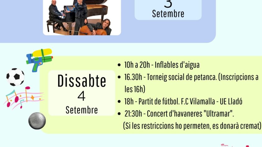 DISSABTE DE FESTA. Una de les novetats de la programació, tal com desgrana el regidor de Festes, és que enguany hi haurà inflables d’aigua a la piscina municipal. «Altres anys programàvem inflables normals i aquesta edició seran inflables d’aigua», afegeix Teixidor. Així doncs, durant tot el dia, de les 10 a les 20 h, hi haurà inflables a la piscina pels més menuts. Pel que fa a la tarda, es farà un torneig de petanca i les inscripcions es podran fer el mateix dia, a partir de les 16 h. A les 18 h es podrà gaudir del partit de futbol FC Vilamalla i UE Lladó. El dia acabarà amb un concert d’havaneres d’un dels grups més destacats de la plana cultural: Ultramar. Des de l’organització destaquen que si les restriccions ho permeten, es donarà cremat als assistents del concert d’havaneres.