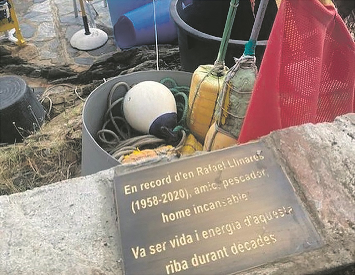 El distintiu té gravat el text «En record d’en Rafael Llinares (1958-2020) amic, pescador, home incansable. Va ser vida i energia d’aquesta riba durant dècades»
