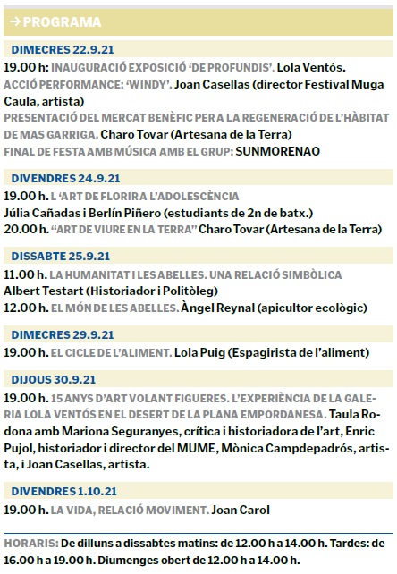 La Galeria Lola Ventós inaugurarà demà la seva darrera exposició De profundis formada per un conjunt de peces creades per l’artista i galerista, que ha estat al capdavant de la galeria des del desembre del 2006. En aquests gairebé quinze anys hi han passat mostres en format audiovisual, musical, fotogràfic, performance... i uns tallers de creativitat que van molt més enllà de l’art