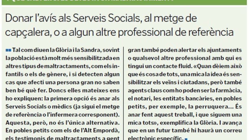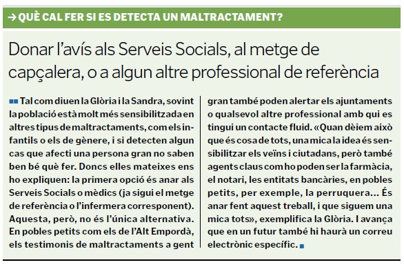 CANVI DE MENTALITAT. A més, per resoldre la problemàtica també cal fer una tasca important de sensibilització i d’empoderament. Sensibilització «perquè tots tinguem aquesta mirada, com a veïns, però també com a comunitat», explica la Glòria, que lamenta: «Un maltractament a un nen, a tothom li fa mal als ulls i mira. Però a vegades, amb maltractaments a gent gran, sap greu, però encara és així, ho justifiquem molt: que el cuidador ha de tenir molta paciència, que no sé què...».