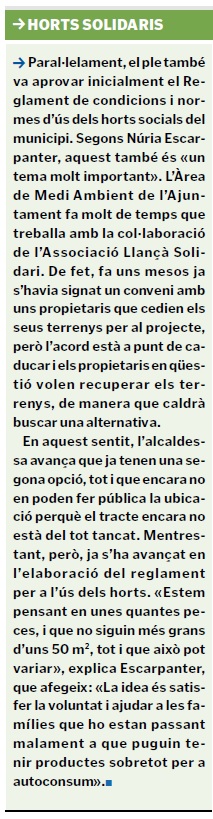 D’altra banda, l’any que ve també hi ha previst continuar millorant les entrades al poble, apostar pel carril bici (amb una segona fase que completarà l’actual), executar les segones fases de l’espai de Joventut i de l’espai Can, canviar les cadires de la Casa de Cultura, fer millores a la riera («perquè no se’ns inundi la zona de Sant Carles si plou amb demesia», diu l’alcaldessa), millorar carrers i asfaltats o fer un projecte d’art urbà. D’aquest últim, Escarpanter n’explica: «Invertirem diners en què els artistes llançanencs ens puguin fer alguna obra i ubicar-les de manera que puguem crear un circuit tipus ruta cultural o similar».