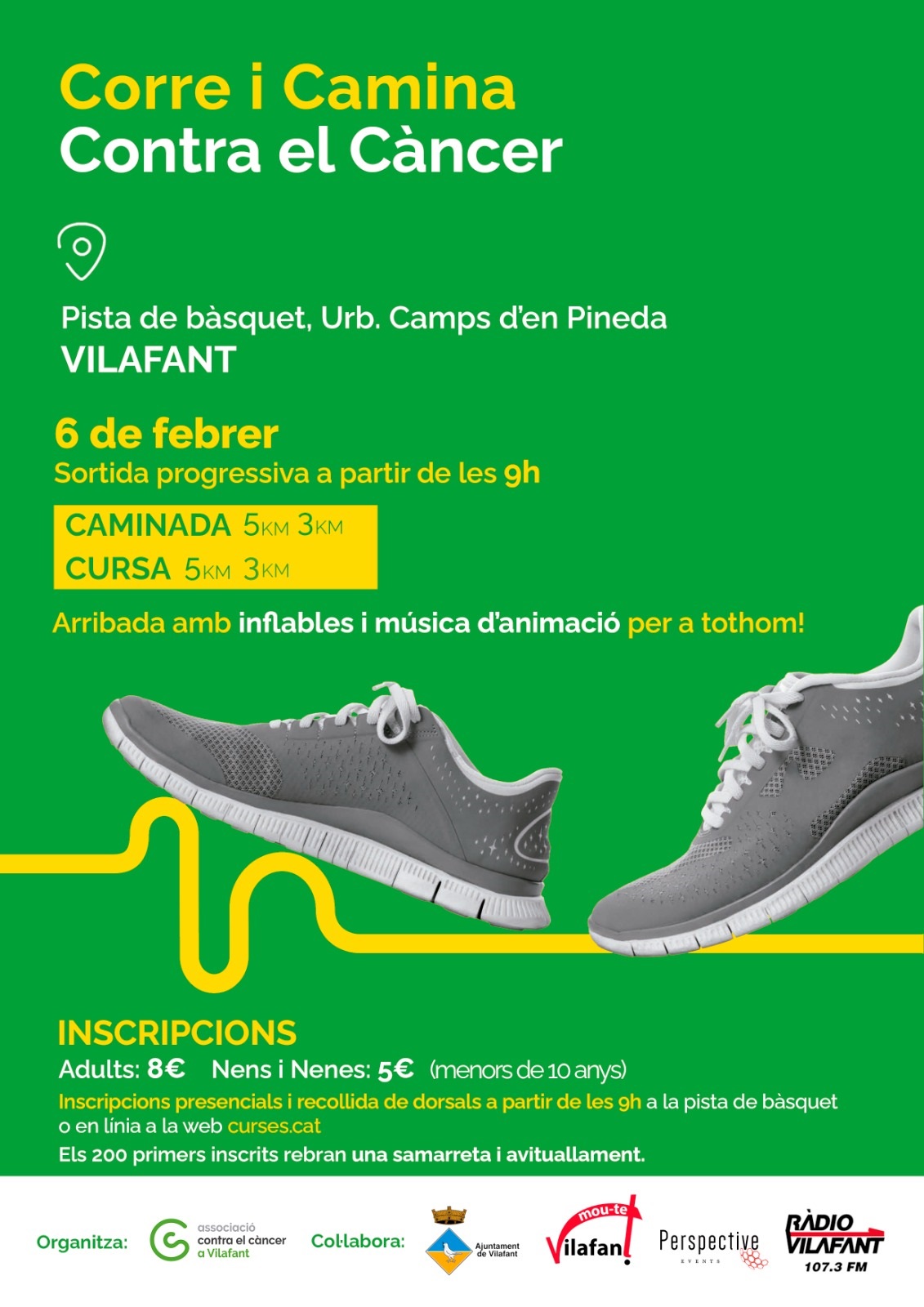 El municipi de Vilafant acull el pròxim diumenge, 6 de febrer, una activitat esportiva solidària per recaptar diners per la lluita contra el càncer. En concret, la localitat celebrarà la prova ‘Corre i camina contra el càncer’, organitzada per l’Associació contra el càncer a Vilafant i que comptarà amb la col·laboració de l’Ajuntament de Vilafant. Es tracta d’una prova de 5 o 3 quilòmetres de distància que es podran completar corrent o caminant.