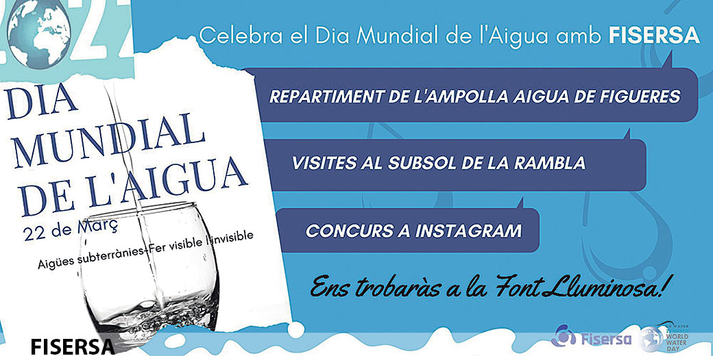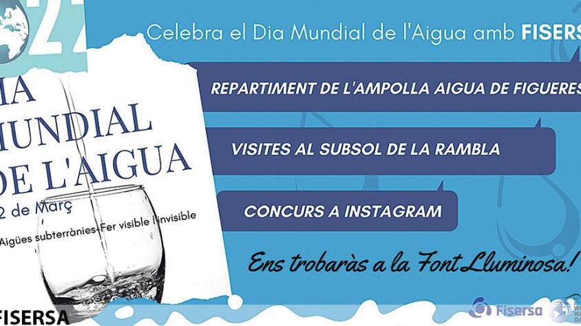 L’empresa plurimunicipal Fisersa de Serveis (Fisersa) celebra a partir d’avui el Dia Mundial de l’Aigua. La jornada designada per les Nacions Unides està dedicada, aquest any, a les aigües subterrànies i té com a objectiu conscienciar sobre la importància de l'anomenat «or blau» i la seva preservació. A Figueres s’han organitzat diferents activitats i per avui hi ha previst el repartiment d’ampolles de vidre d’Aigua de Figueres. L’horari serà des de les 9 h del matí fins a les 13 h del migdia.