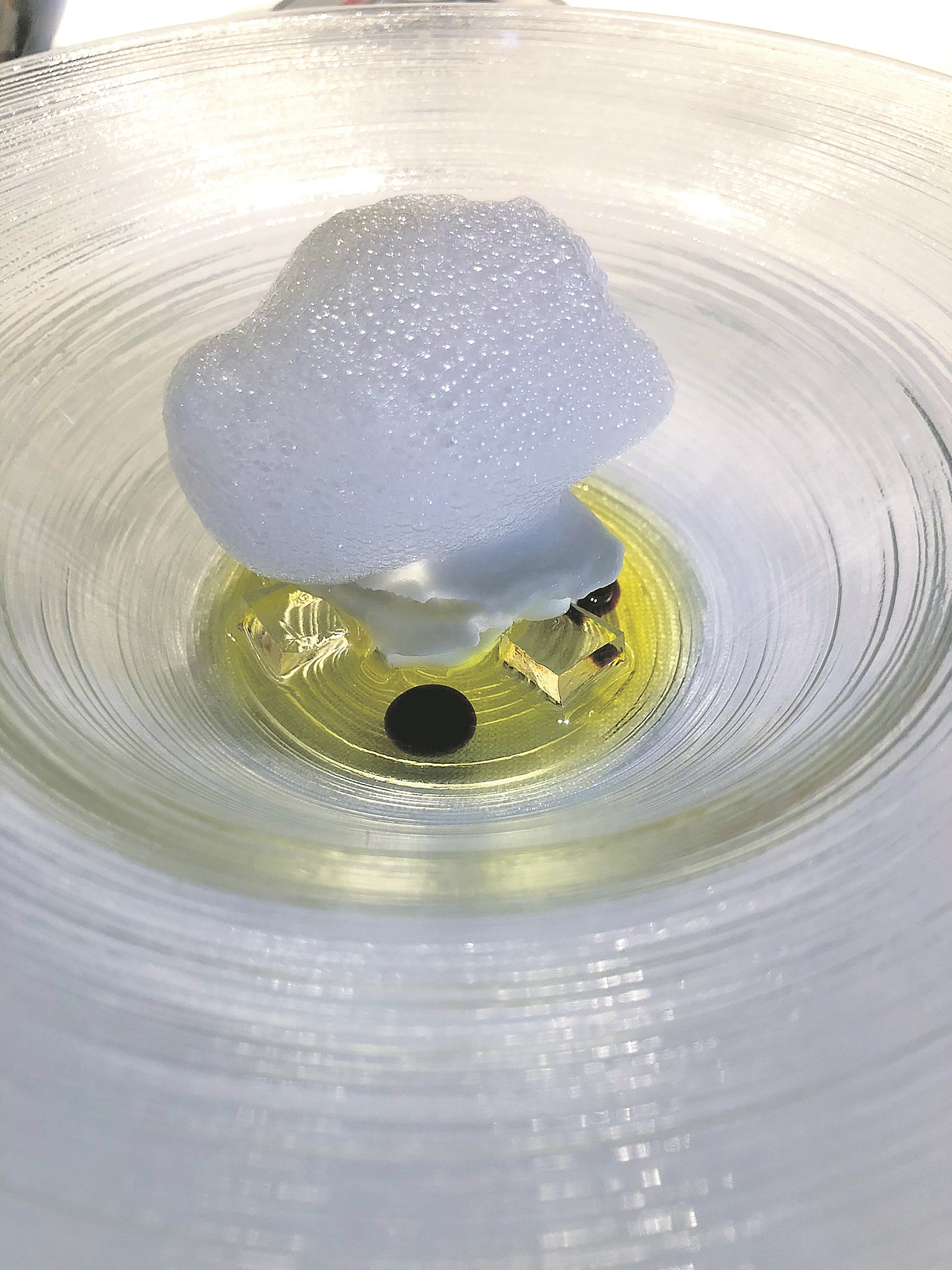EL CARRO DE GEREZ I LES POSTRES. Un cop acabats els principals, és l’hora de Toni Gerez, el sommelier i formatger per excel·lència de la nostra zona. Amb prop d’una setantena de referències d’arreu del territori i del món, Gerez es presenta a la taula per oferir el seu carro de formatges, tot i que durant el dinar ja ens ha fet tastar alguns dels millors. Finalment, arriben les postres. La primera proposta dolça és un gelat de flor de taronger, oli d’oliva, gelatina de licor de préssec i aire de mel (imatge 5) i la traca final conclou amb una pera nixtamalitzada (cruixent per fora i cremosa per dins) al vi Finca Espolla amb nata aromatitzada i xocolata 70%.