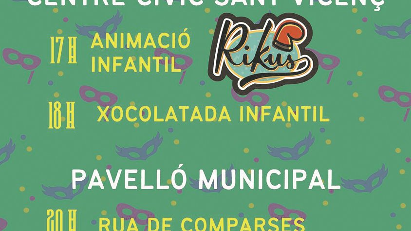 CENTRE CÍVIC SANT VICENÇ. Com hem dit, la jornada carnavalesca començarà dissabte a les 17 h amb un espectacle d’animació infantil a càrrec de la companyia Rikus, que aquest any han estrenat nou espectacle. La festa acabarà amb una xocolatada infantil per a tots els assistents, que se servirà a les 18 h.