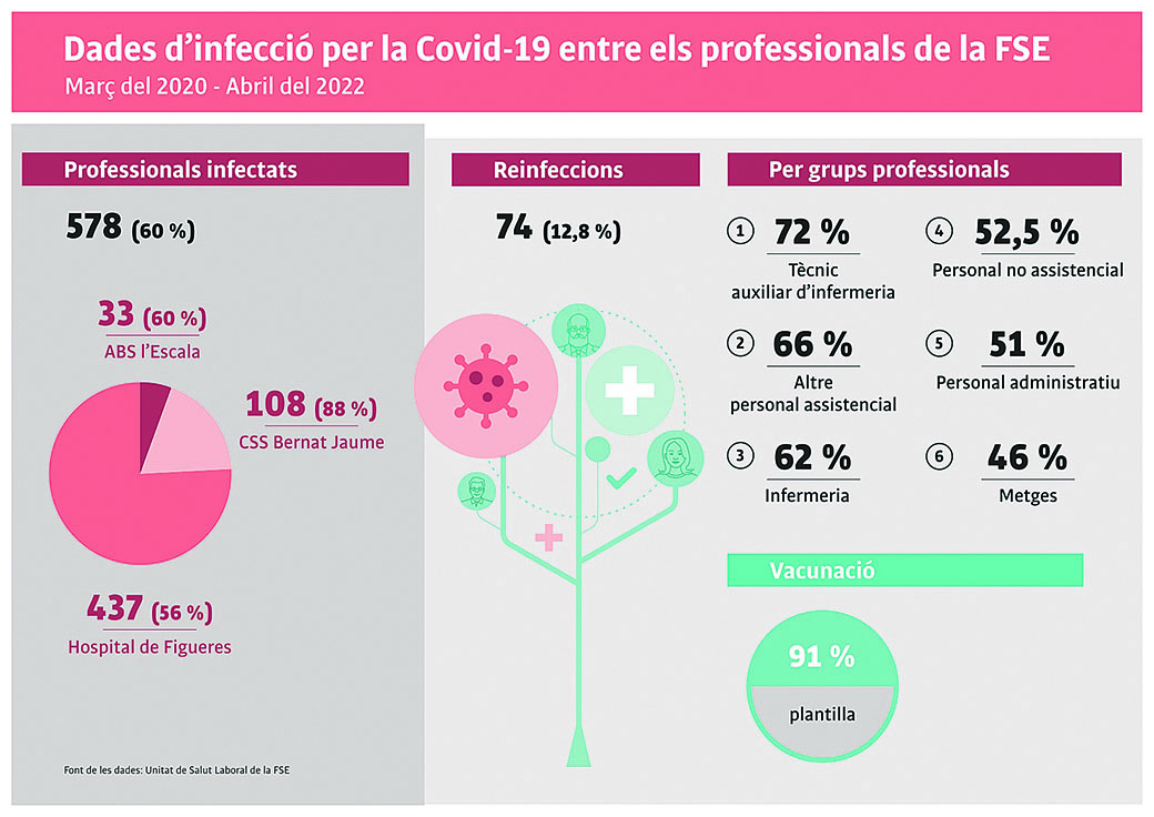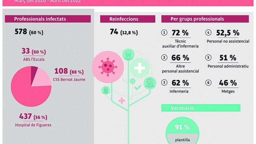 Aquests canvis arriben just la setmana en què la Unitat de Salut Laboral de la Fundació Salut Empordà ha donat a conèixer que entre el març del 2020 i l’abril del 2022 s’han infectat 578 professionals; és a dir, el 60% de la plantilla.