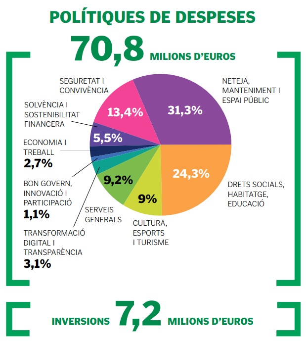En l’apartat de despeses es destina a personal la xifra de 21,3 milions d’euros. Això es justifica per l’increment salarial dels treballadors públics aprovat pel Govern espanyol. A més, també es preveu la incorporació d’un arquitecte tècnic, un treballador social i un tècnic del Pla educatiu d’entorn. També es reforça el personal de l’Oficina de Turisme i a Serveis Socials s’incorporarà un psicòleg, set educadors socials, un jurista, un coordinador i un tècnic auxiliar. Pel que fa a l’endeutament previst, és d’un 21,52% menys que l’any anterior (4 milions d’euros), xifra que situa l’Ajuntament al 49%, molt per sota del límit legal del 75%.Del total de les inversions, 4 milions seran procedents d’una operació de crèdit. D’altra banda, es manté la idea de vendre la casa Nouvilas, de la qual l’Ajuntament té més del 60%. Això siginificaria ingressar 987.700 euros.