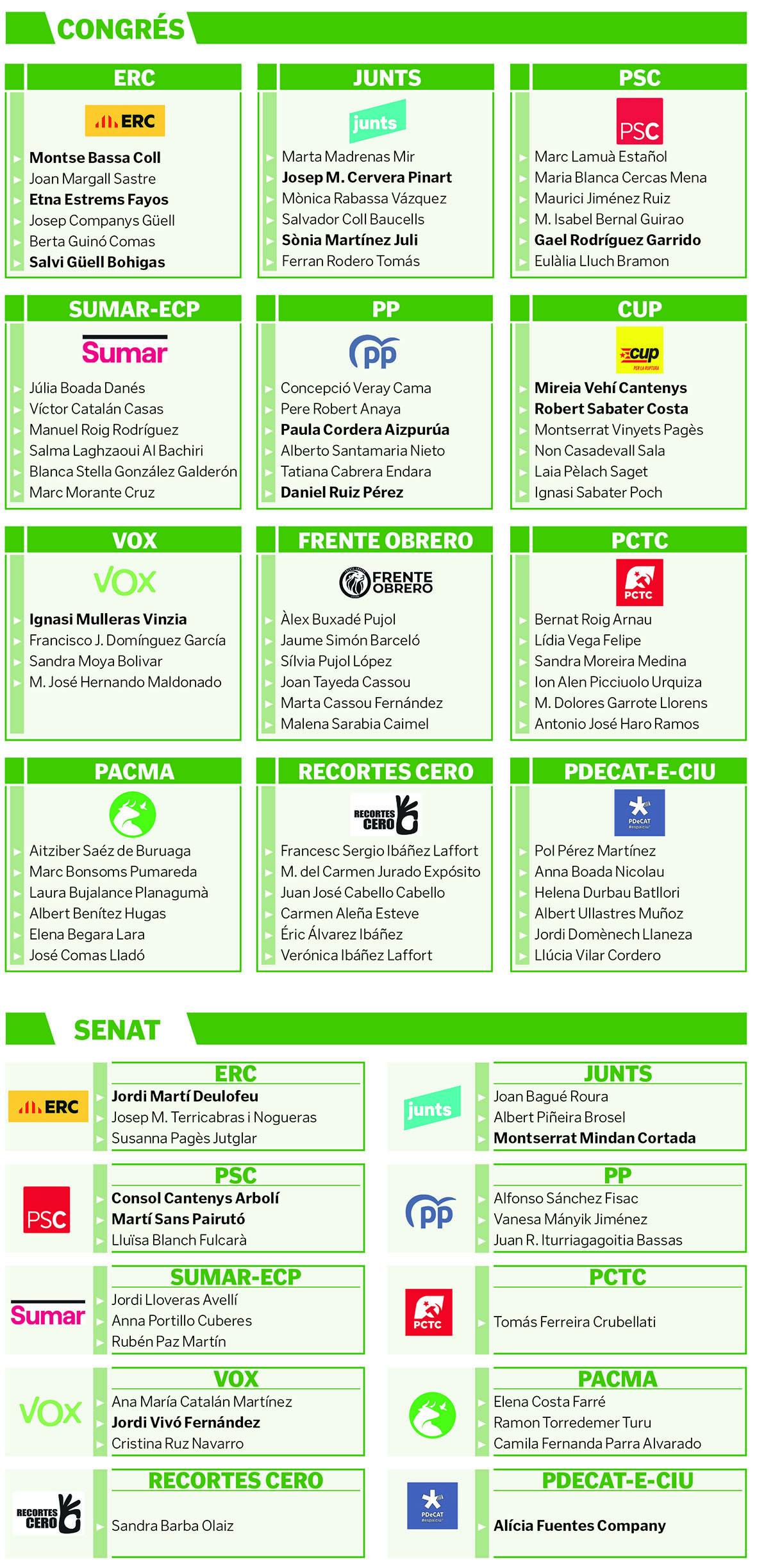 A les files del PSC i a la llista al Congrés també hi trobem el flamant nou alcalde de Portbou, Gael Rodríguez (5), i un històric del PSC a l’Alt Empordà, Martí Sans, es presenta com a senador. El PP té a la llista per al Congrés Paula Cordera, que anava a la llista de les municipals per Figueres, i també hi ha el popular figuerenc Daniel Ruiz. D’altra banda, Alicia Fuentes, exregidora de Castelló, és candidata al Senat i, finalment, el regidor de Vox a Roses, Ignasi Mulleras, encapçala la llista al Congrés, i el regidor figuerenc Jordi Vivó va de 2 per al Senat.