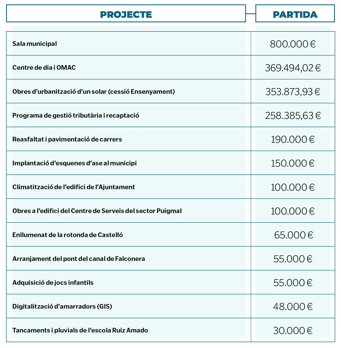 Entre les inversions més destacades hi ha la tan anhelada reforma de la sala municipal o l’habilitació del centre de dia i l’OMAC (vegeu-ne més al requadre). Però els comptes també destinaran 100.000 euros a diverses obres generals, 40.000 euros a la pintura d’edificis públics, 40.000 euros més a un sistema digital de sancions, 10.000 euros per instal·lar nous serveis a les platges o 35.000 euros a arranjar els ponts per a vianants d’Empuriabrava, entre d’altres. A més, es reserven 250.000 euros pels pressupostos participatius.