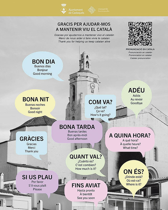 L’Ajuntament de Cadaqués edita cartells i fulletons amb paraules senzilles en català i traduïdes al castellà, el francès i l’anglès perquè els visitants estrangers puguin descobrir i fer servir la llengua del territori
